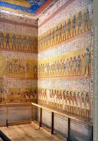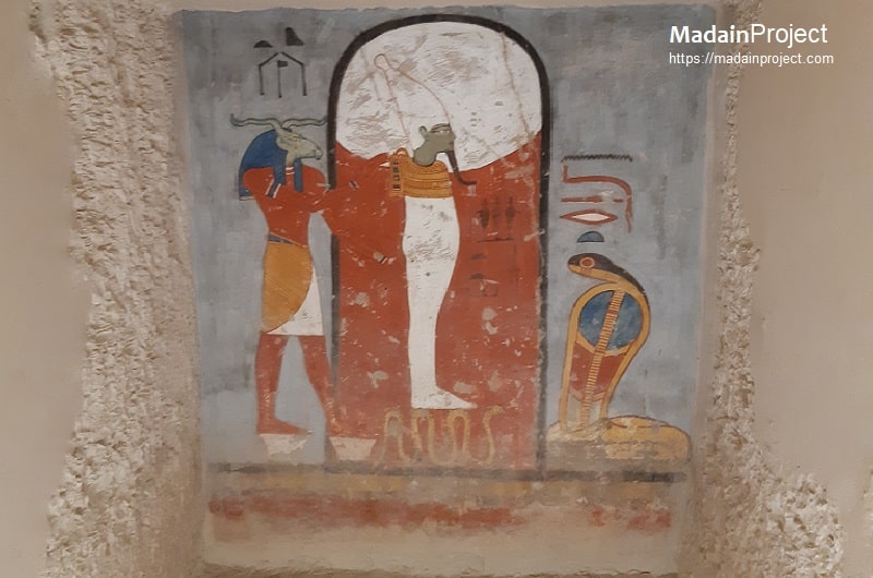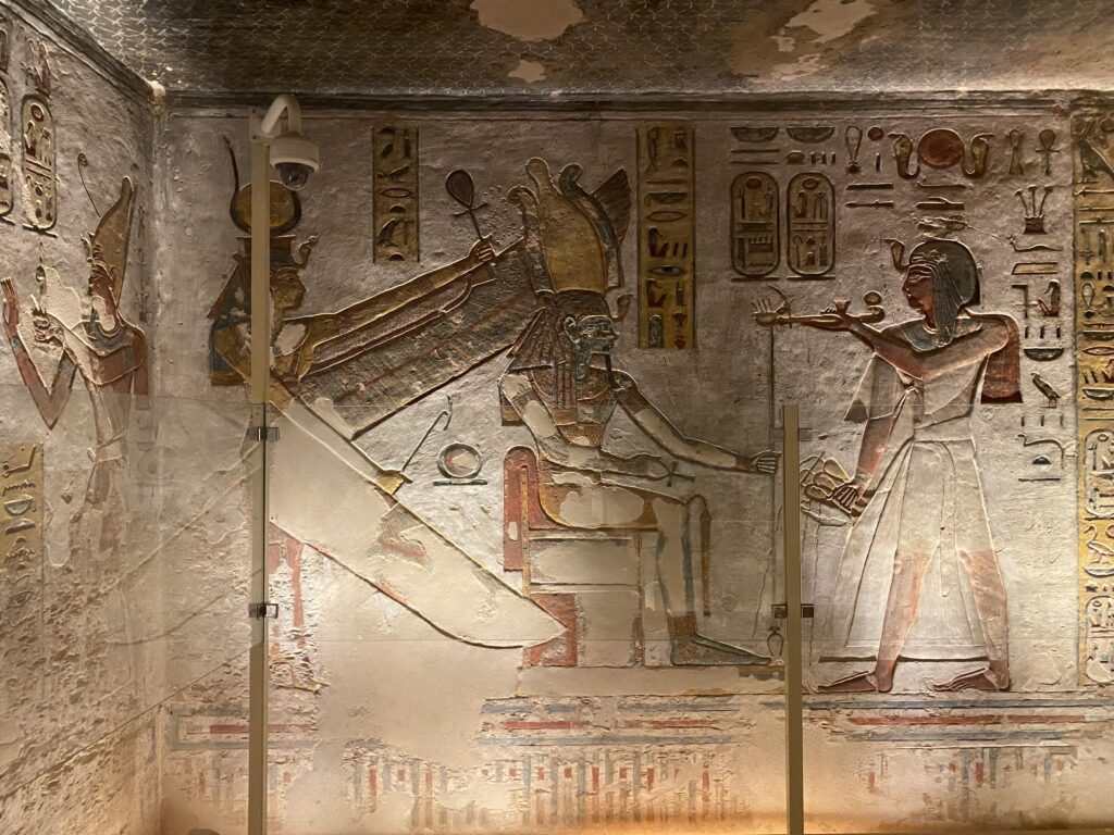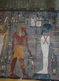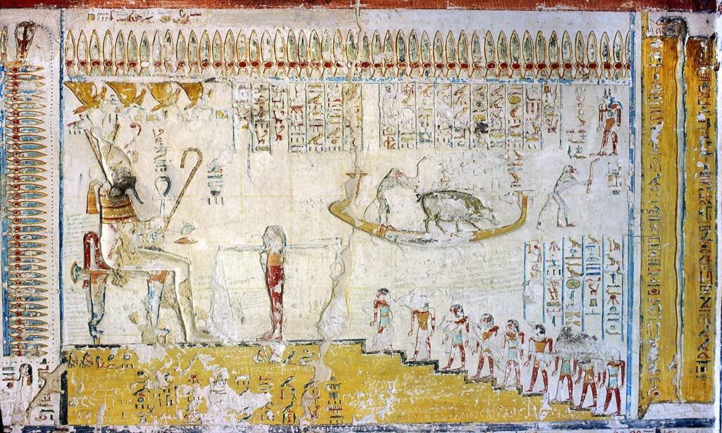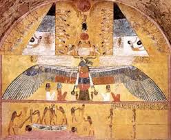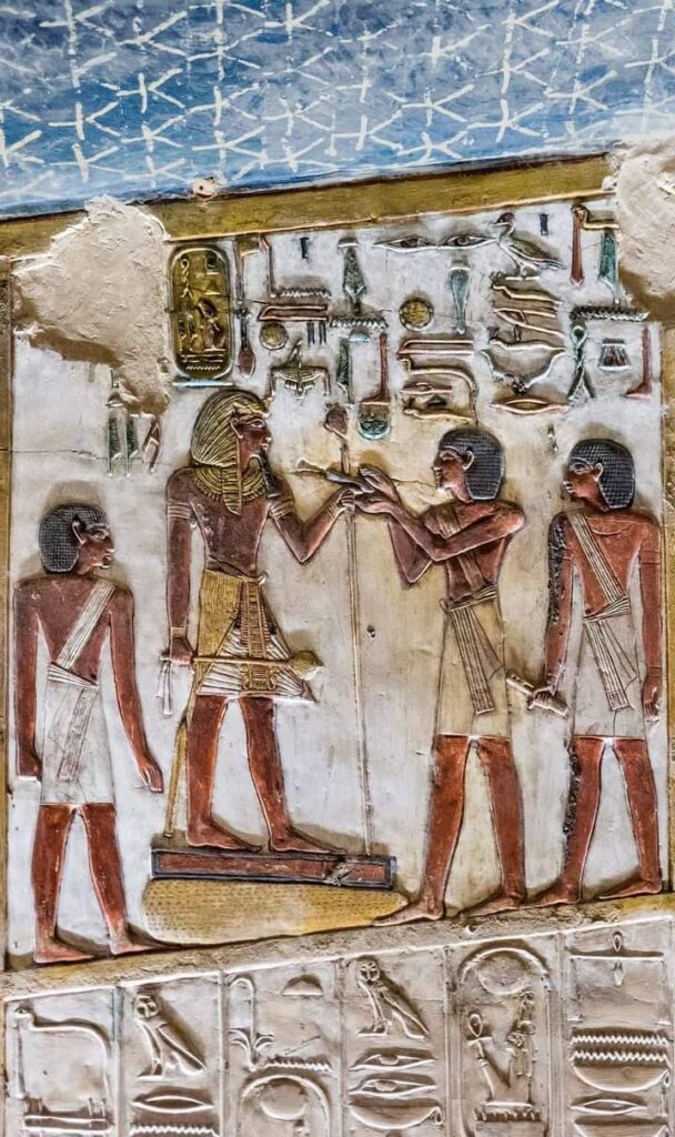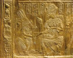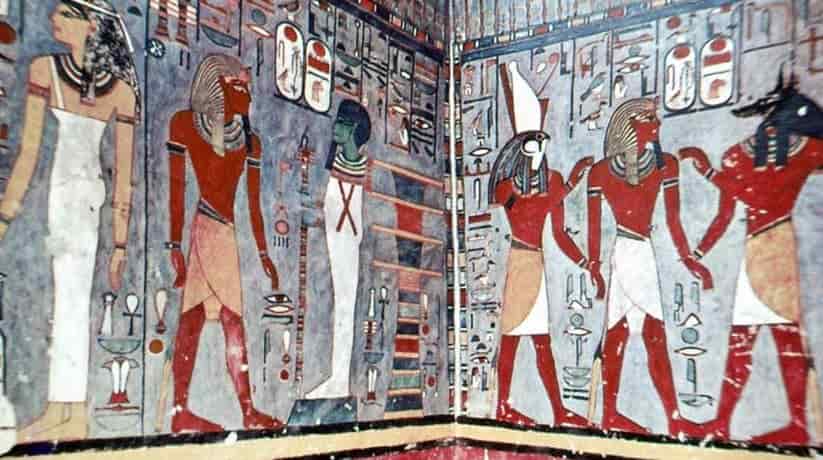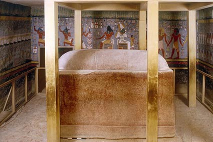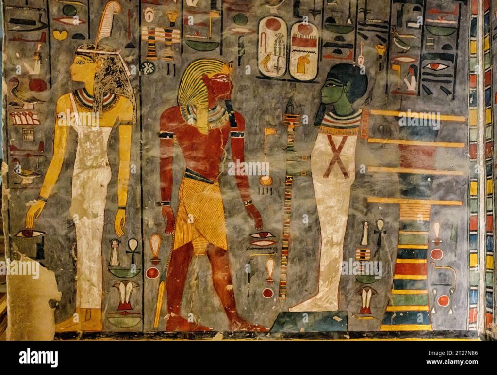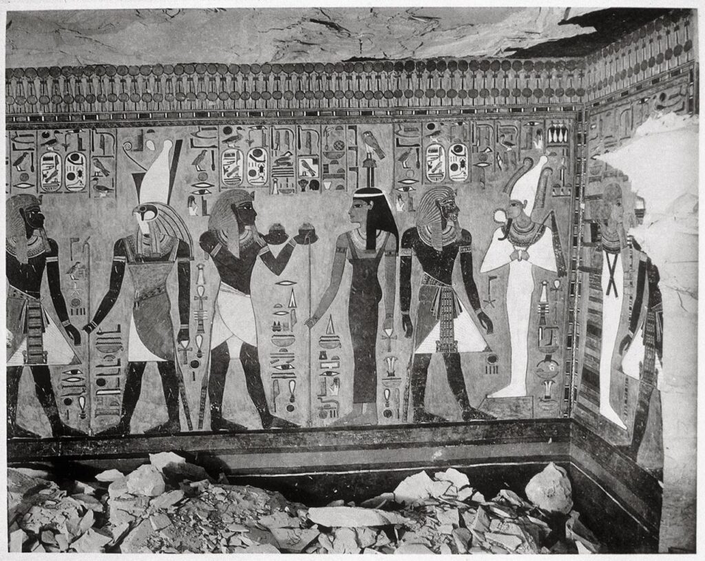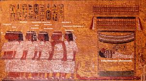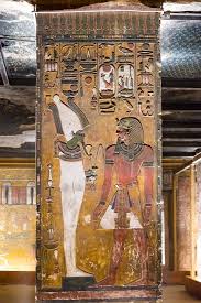 The north wall of the burial chamber depicts three separate scenes, ordered from right to left. In the first, Ay, Tutankhamen’s successor, performs the “opening of the mouth” ceremony on Tutankhamen, who is depicted as Osiris, lord of the underworld. In the middle scene, Tutankhamen, dressed in the costume of the living king, is welcomed into the realm of the gods by the goddess Nut. On the left, Tutankhamen, followed by his ka (spirit twin), is embraced by Osiris.