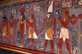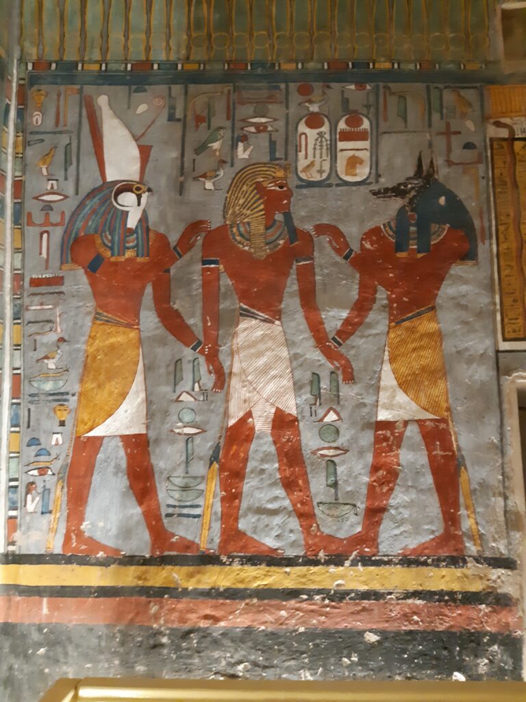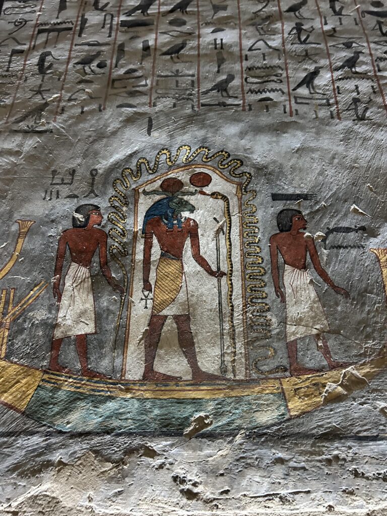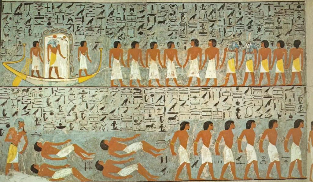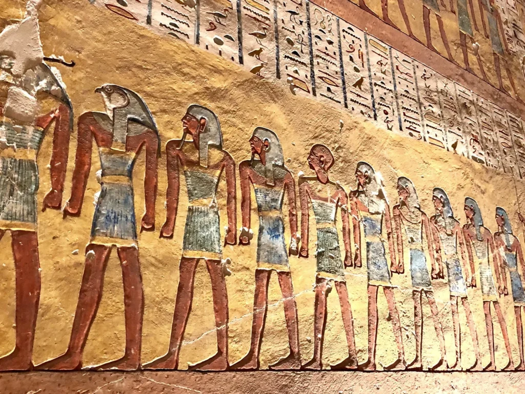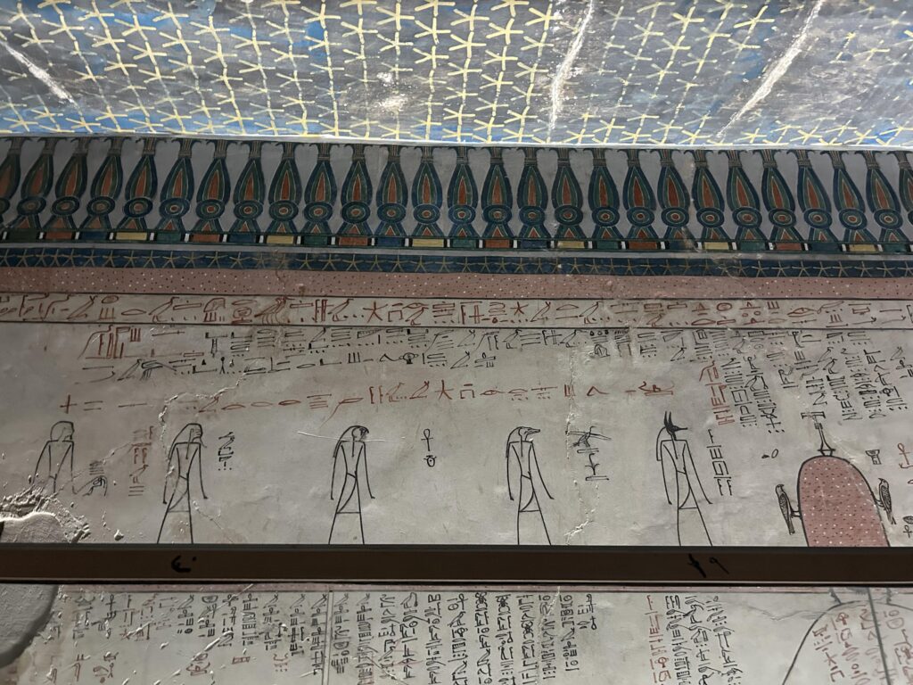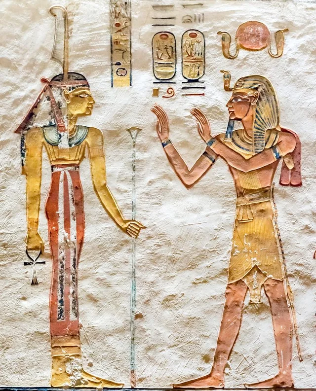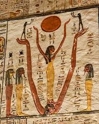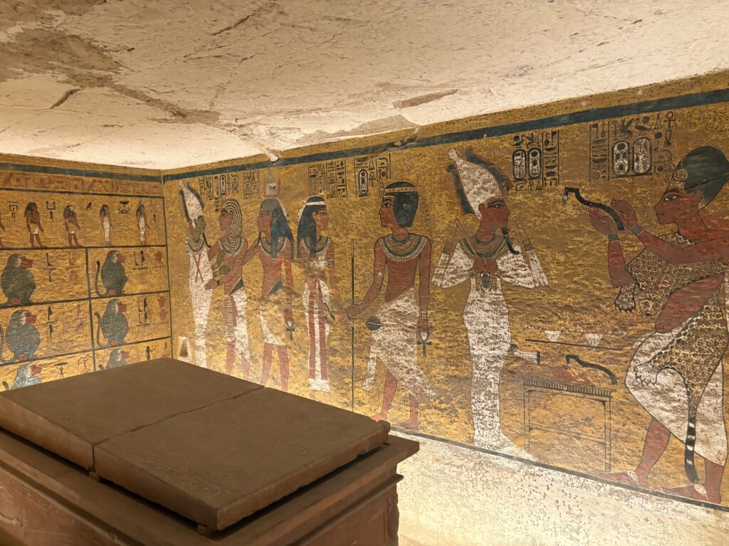 The north wall of the burial chamber depicts three separate scenes, ordered from right to left. In the first, Ay, Tutankhamen’s successor, performs the “opening of the mouth” ceremony on Tutankhamen, who is depicted as Osiris, lord of the underworld. In the middle scene, Tutankhamen, dressed in the costume of the living king, is welcomed into the realm of the gods by the goddess Nut. On the left, Tutankhamen, followed by his ka (spirit twin), is embraced by Osiris.