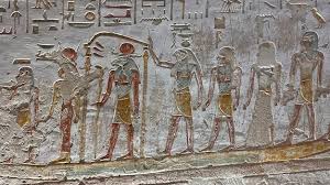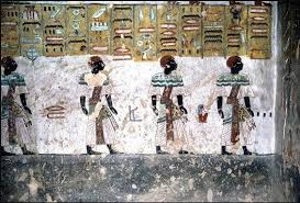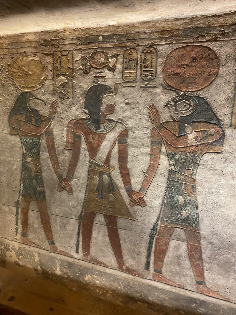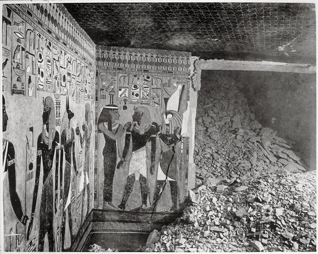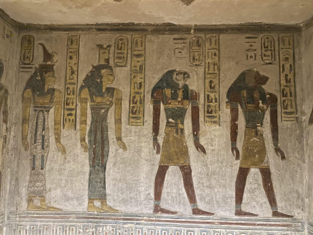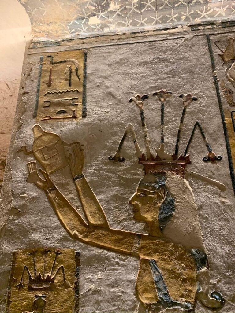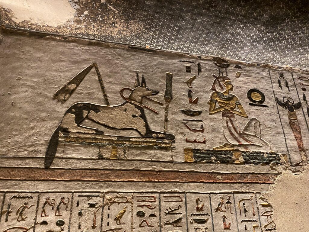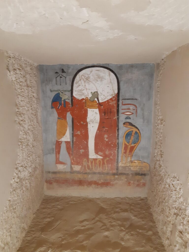 The north wall of the burial chamber depicts three separate scenes, ordered from right to left. In the first, Ay, Tutankhamen’s successor, performs the “opening of the mouth” ceremony on Tutankhamen, who is depicted as Osiris, lord of the underworld. In the middle scene, Tutankhamen, dressed in the costume of the living king, is welcomed into the realm of the gods by the goddess Nut. On the left, Tutankhamen, followed by his ka (spirit twin), is embraced by Osiris.