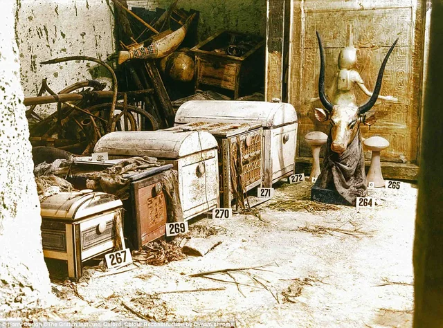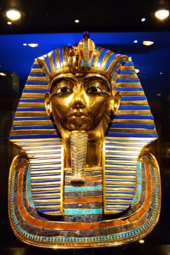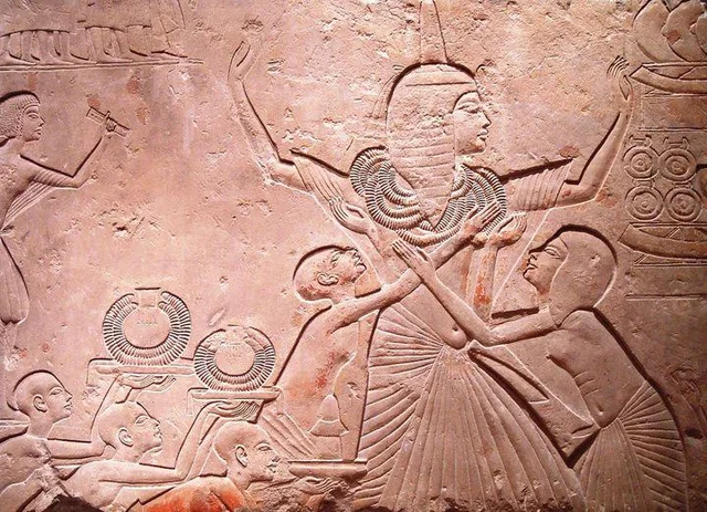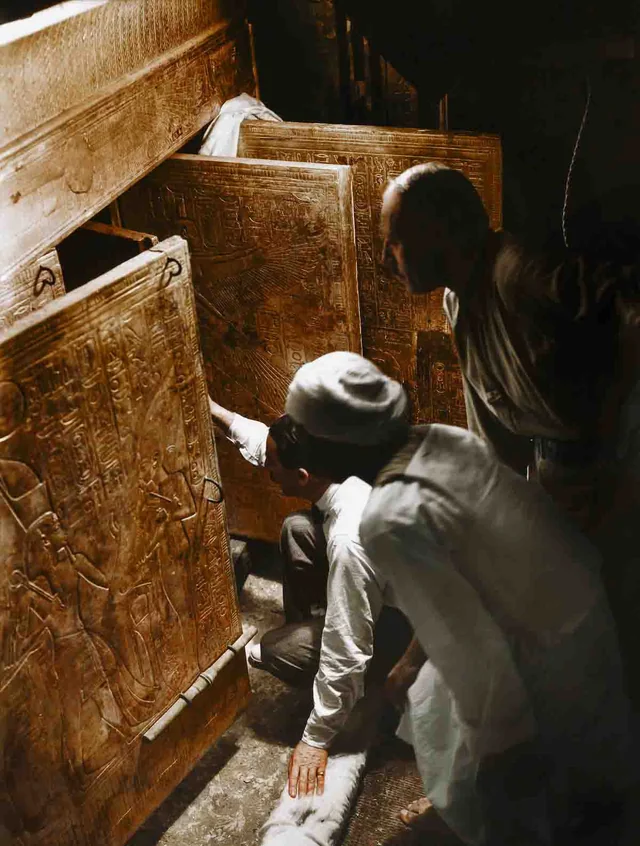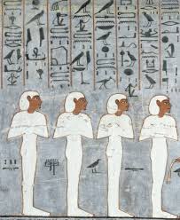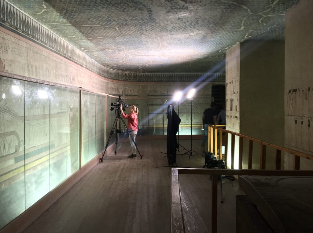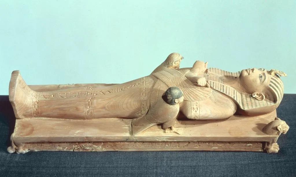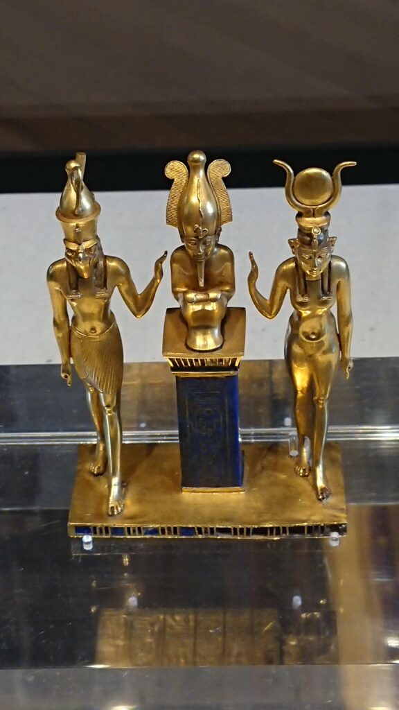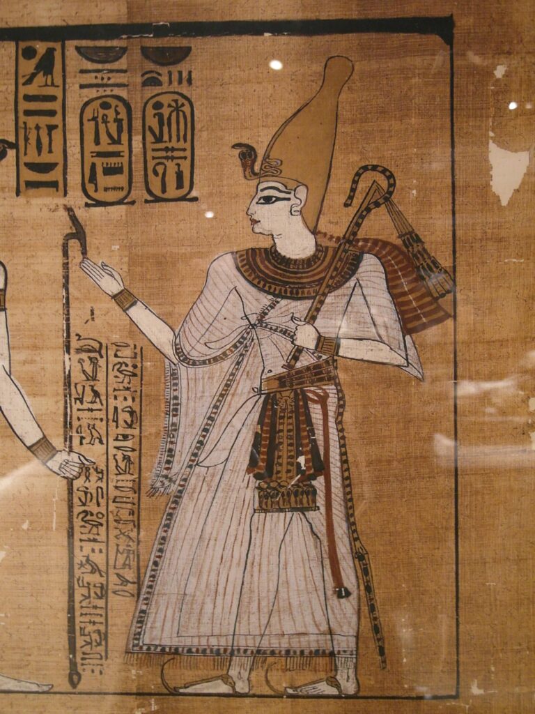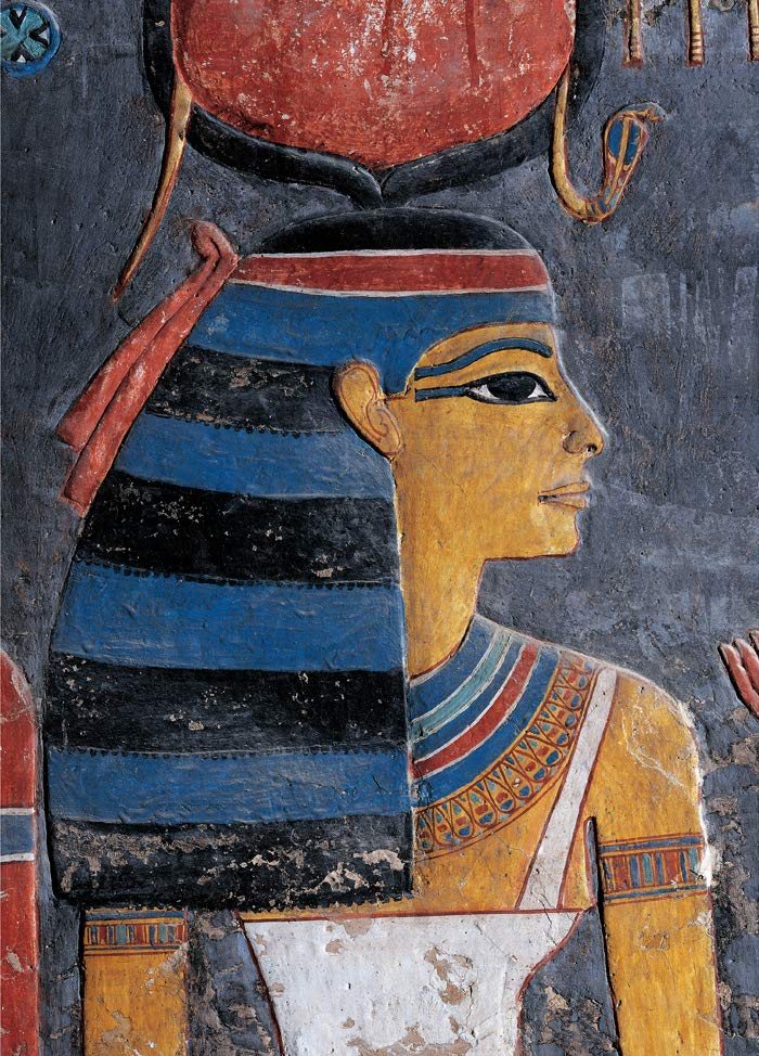 The north wall of the burial chamber depicts three separate scenes, ordered from right to left. In the first, Ay, Tutankhamen’s successor, performs the “opening of the mouth” ceremony on Tutankhamen, who is depicted as Osiris, lord of the underworld. In the middle scene, Tutankhamen, dressed in the costume of the living king, is welcomed into the realm of the gods by the goddess Nut. On the left, Tutankhamen, followed by his ka (spirit twin), is embraced by Osiris.