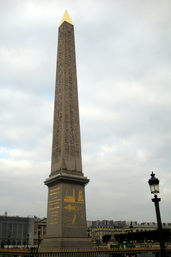 “L’OBÉLISQUE DE LOUQSOR ÉRIGÉ À THÈBES SOUS LE RÈGNE DE RAMESSÈS II ENVIRON TREIZE SIÈCLES AVANT L’ÈRE CHRÉTIENNE A ÉTÉ DONNÉ À LA FRANCE PAR MÉHÉMET ALI VICE-ROI D’ÉGYPTE ET ÉLEVÉ SUR CETTE PLACE LE 25 OCTOBRE 1836 SOUS LE RÈGNE DE LOUIS-PHILIPPE ROI DES FRANÇAIS.”
