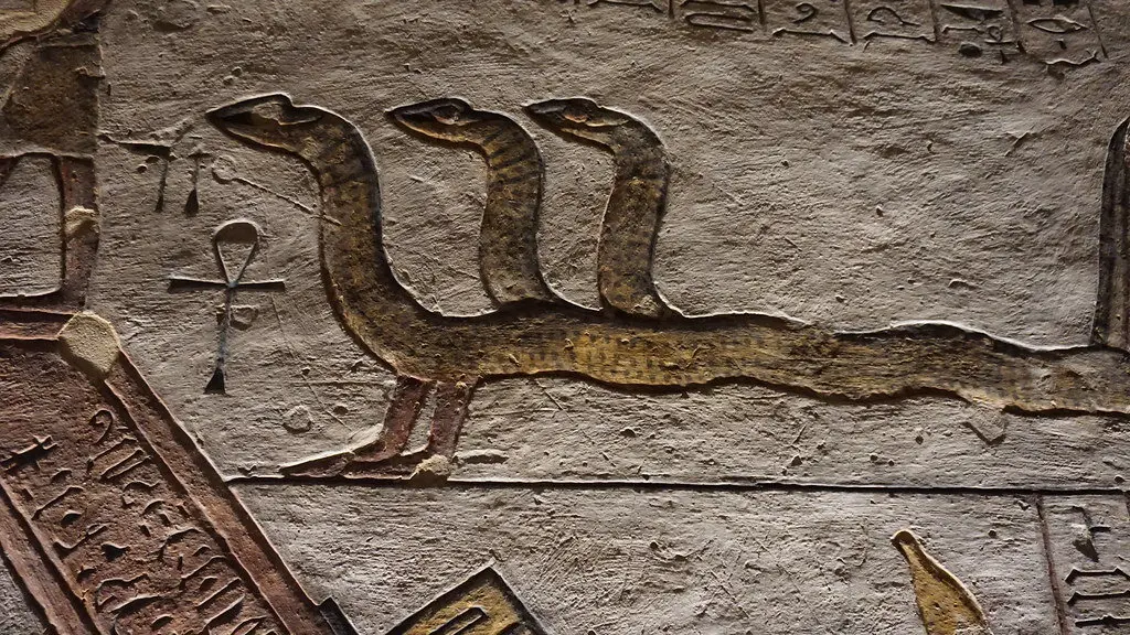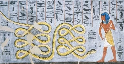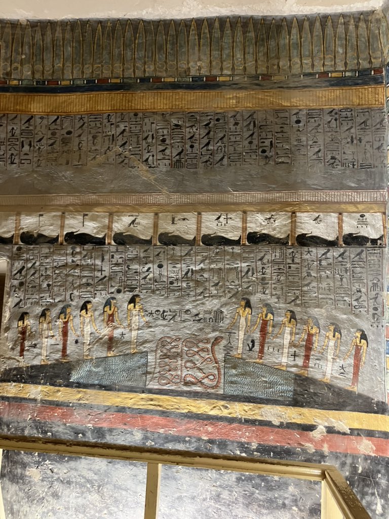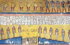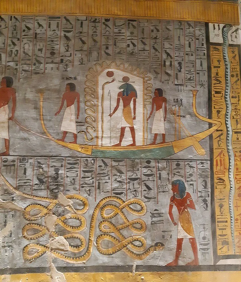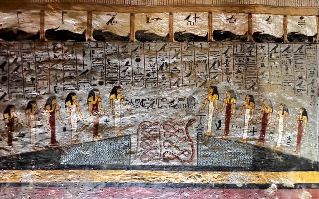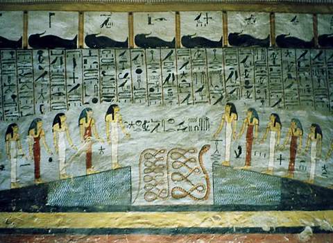 Book of Caverns, fifth division, scene 9: cobras guarding decapitated enemies in a cauldron.; Wall painting and relief carving in the tomb of Rameses V and Rameses VI KV9 in the Valley of the Kings at Thebes, Luxor Egypt.Book of Caverns, fifth division, scene 9: cobras guarding decapitated enemies in a cauldron.; Wall painting and relief carving in the tomb of Rameses V and Rameses VI KV9 in the Valley of the Kings at Thebes, Luxor Egypt.xr:d:DAFu6Ozcn-8:2545,j:1790597668514114688,t:24012715xr:d:DAFqdMNv1ow:1083,j:1109412157258778592,t:23082418A detail of the painting of the 6th section of the Book of Caverns on the wall of the sarcophagus hall of the tomb of Ramses VI, Egypt. Ancient Egyptian. 20th dynasty c 1143 1136 BC. Valley of Kings, West Thebes. (Photo by Werner Forman/Universal Images Group/Getty Images)Image processed by CodeCarvings Piczard ### FREE Community Edition ### on 2020-10-20 15:25:34Z | http://piczard.com | http://codecarvings.com