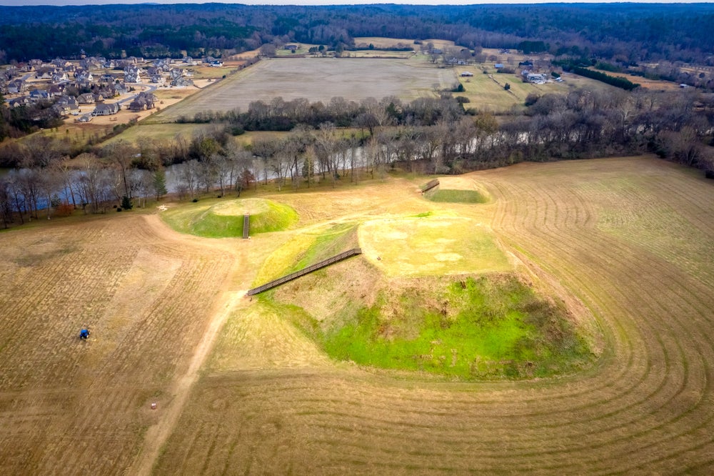 Artists conception of the Etowah site (9BR1), a Mississippian culture archaeological site located on the banks of the Etowah River in Bartow County, Georgia. Built and occupied in three phases, from 10001550 CE. All rights held by the artist, Herb Roe © 2016.